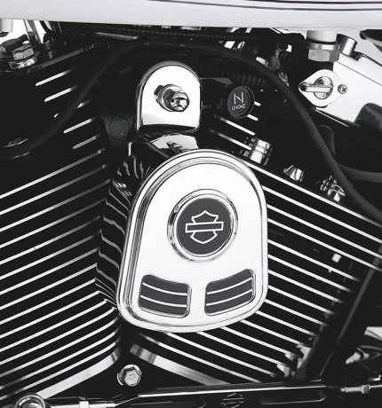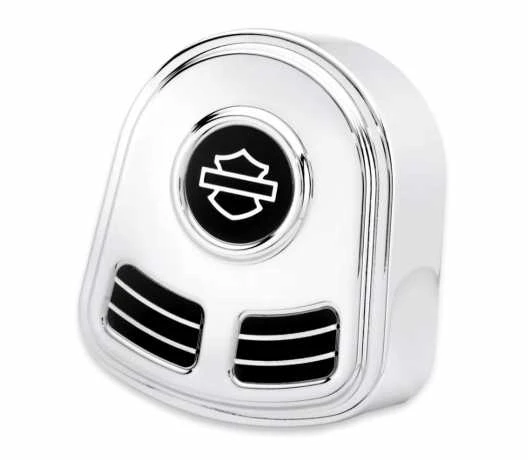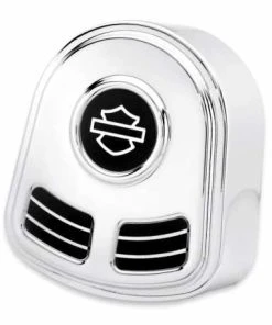 Ergänzen Sie die Kühlrippen Ihres Motors mit dieser verchromten Hupenabdeckung mit gravierten Einsätzen, die mit einem Bar & Shield Emblem versehen sind, das sich von einem schwarzen Hintergrund abhebt.