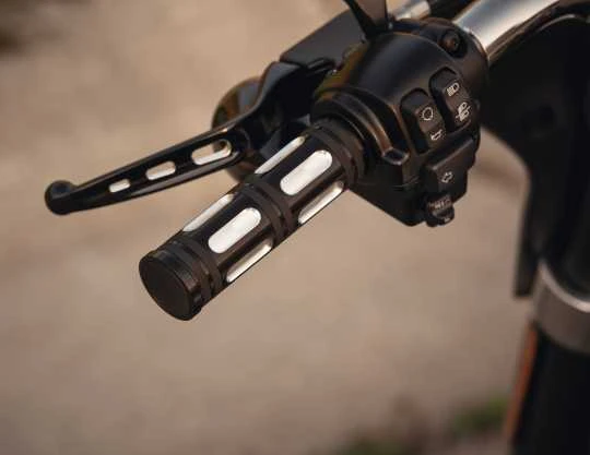 Die Lenkergriffe haben einen bequemen 1,5″-Durchmesser, und die maschinell bearbeiteten Schlitze und schmalen Gummistreifen bieten mit oder ohne Handschuhe einen sicheren Halt.