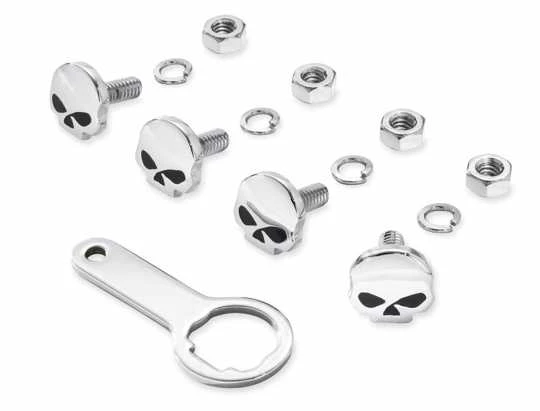 Zeigen Sie Ihr “wahres Gesicht”. Dieses komplette Nummernschild-Montagekit enthält verchromte Schrauben in Totenkopfform mit schwarzen Augenhöhlen.